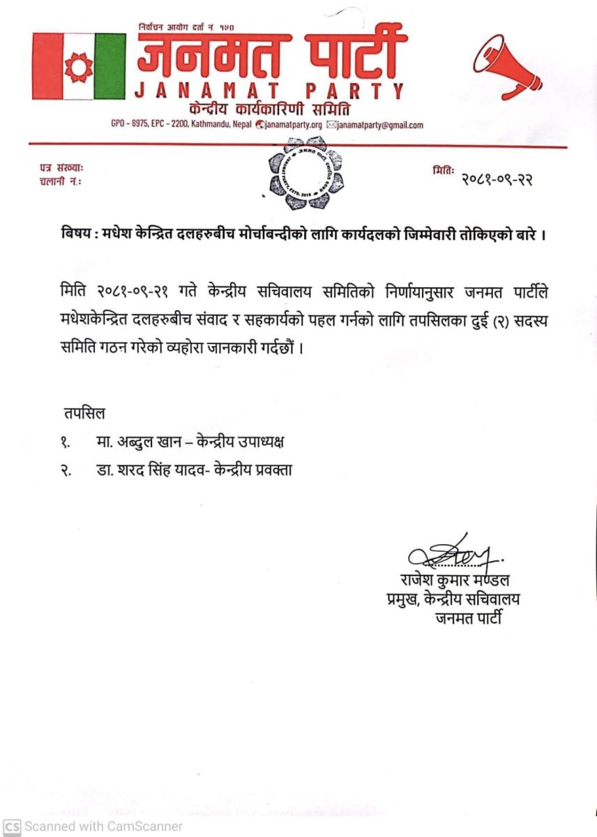 काठमाडौं । जनमत पार्टीले मधेश केन्द्रित दलहरुबीच मोर्चाबन्दीको संवादका लागि समिति गठन गरेको छ। आज (सोमबार) जनमतले एक विज्ञप्ति जारी गर्दै दुई सदस्यीय समिति गठन गरेको जानकारी दिएको हो । जनमतका केन्द्रीय सचिवालय प्रमुख राजेशकुमार मण्डलका अनुसार केन्द्रीय उपाध्यक्ष अब्दुल खान र प्रवक्ता शरदसिंह यादवलाई सदस्य तोकिएको छ ।