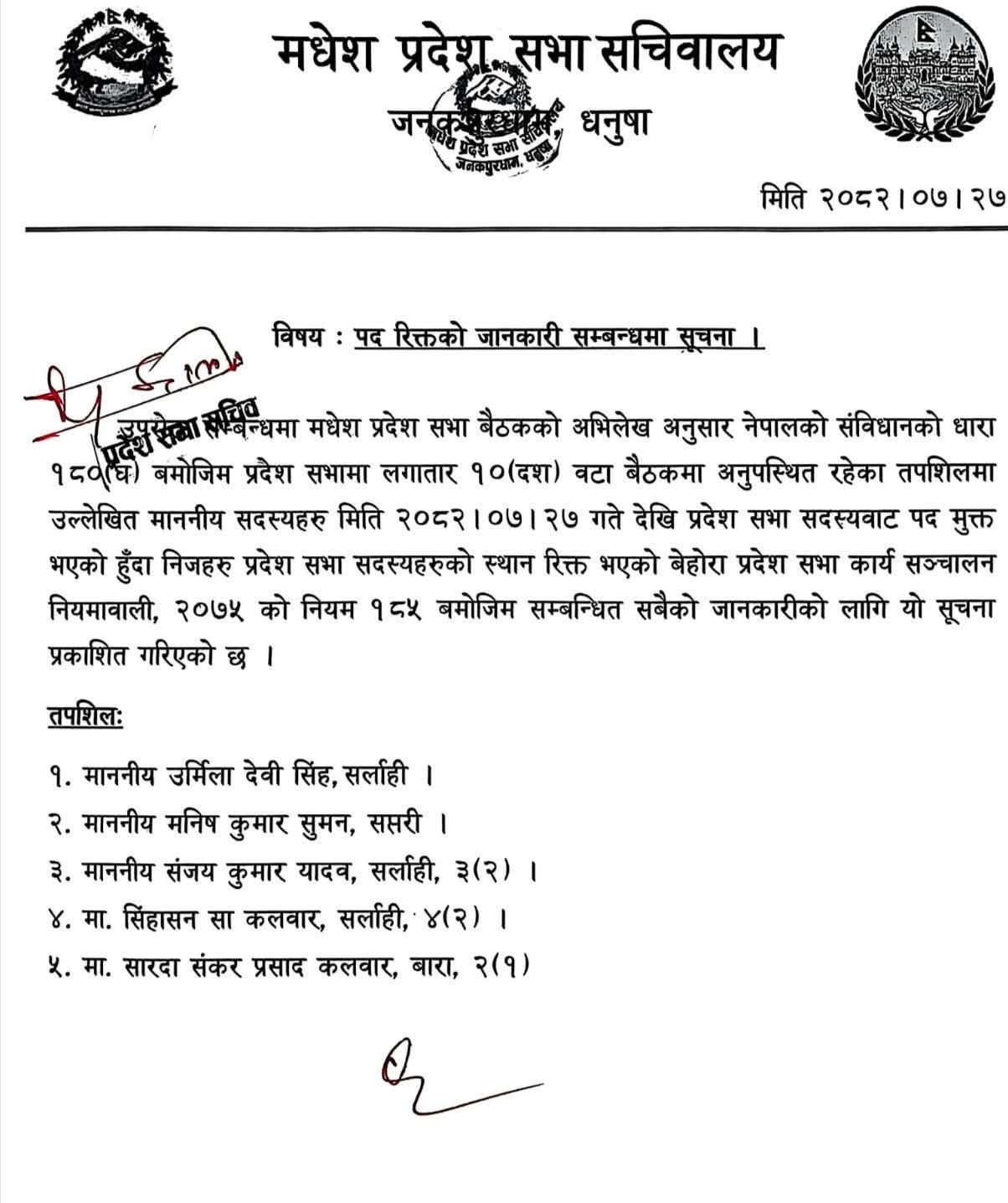 प्रदेशसभा सचिवालयद्वारा कार्तिक २७ गते जारी सूचनामा भनिएको छ, नेपालको संविधानको धारा १८० (घ) तथा प्रदेशसभा कार्य सञ्चालन नियमावली, २०७५ को नियम १८४ बमोजिम लगातार १० वटा बैठकमा अनुपस्थित रहेकाले उनीहरूको स्थान रिक्त भएको हो।