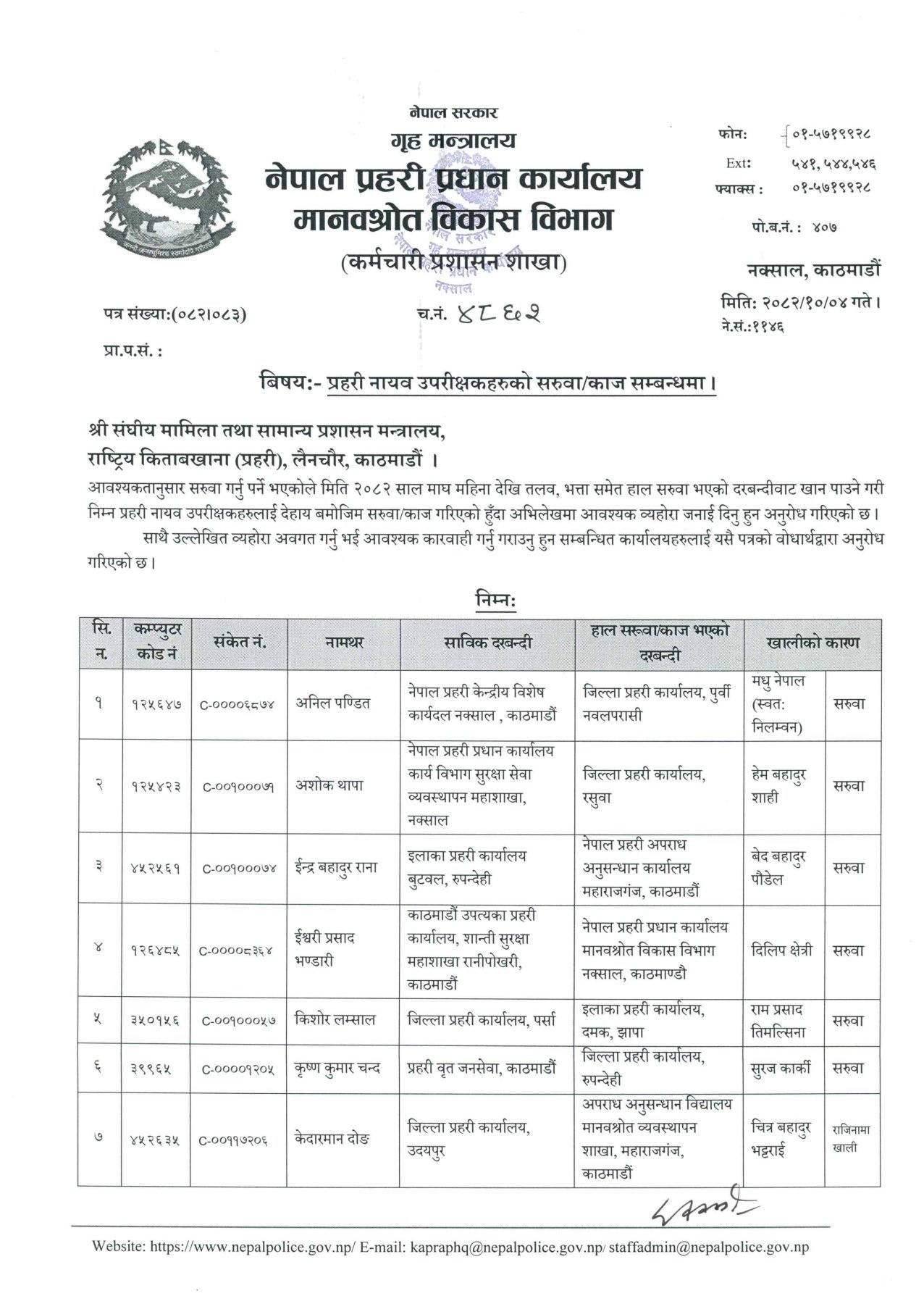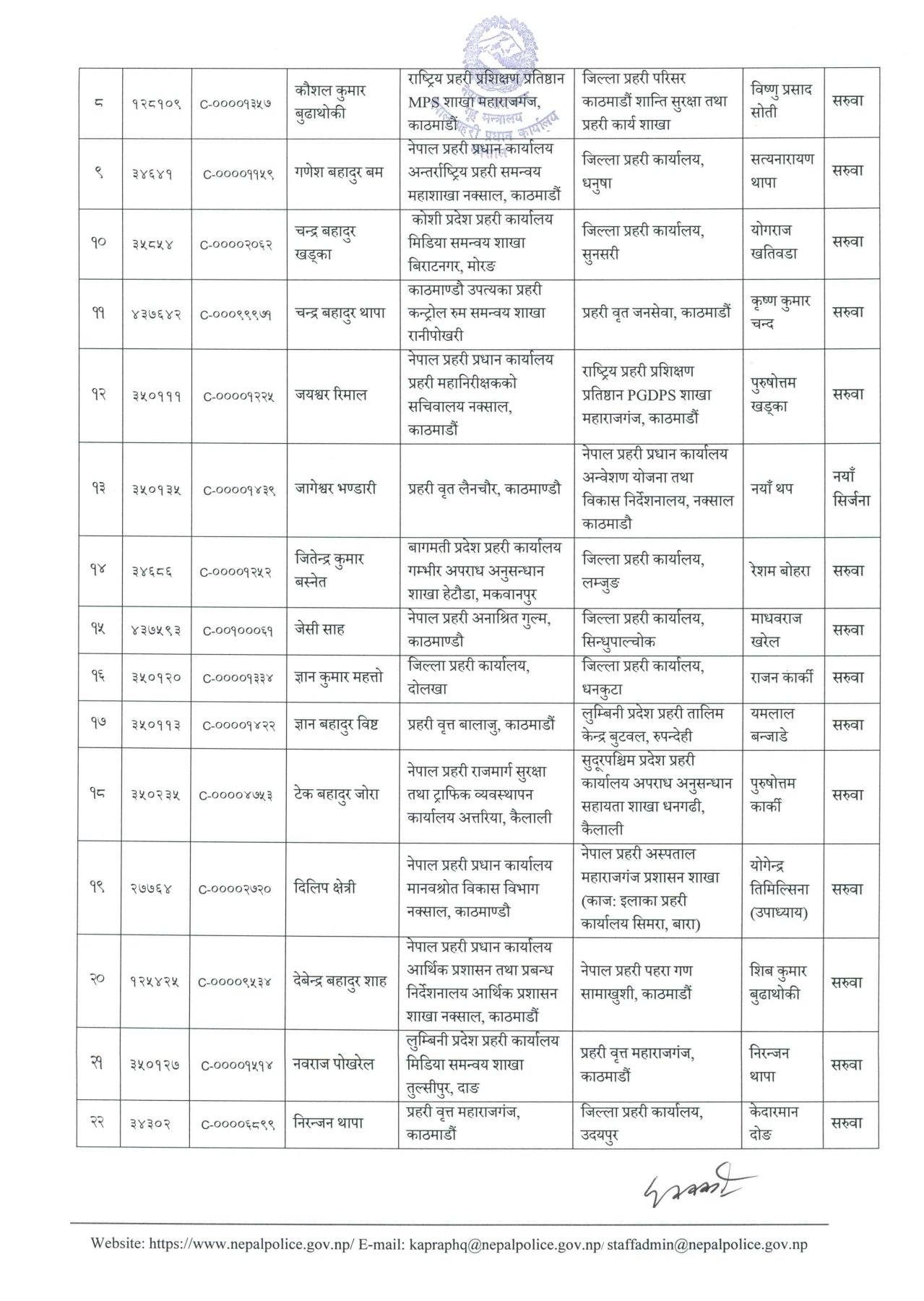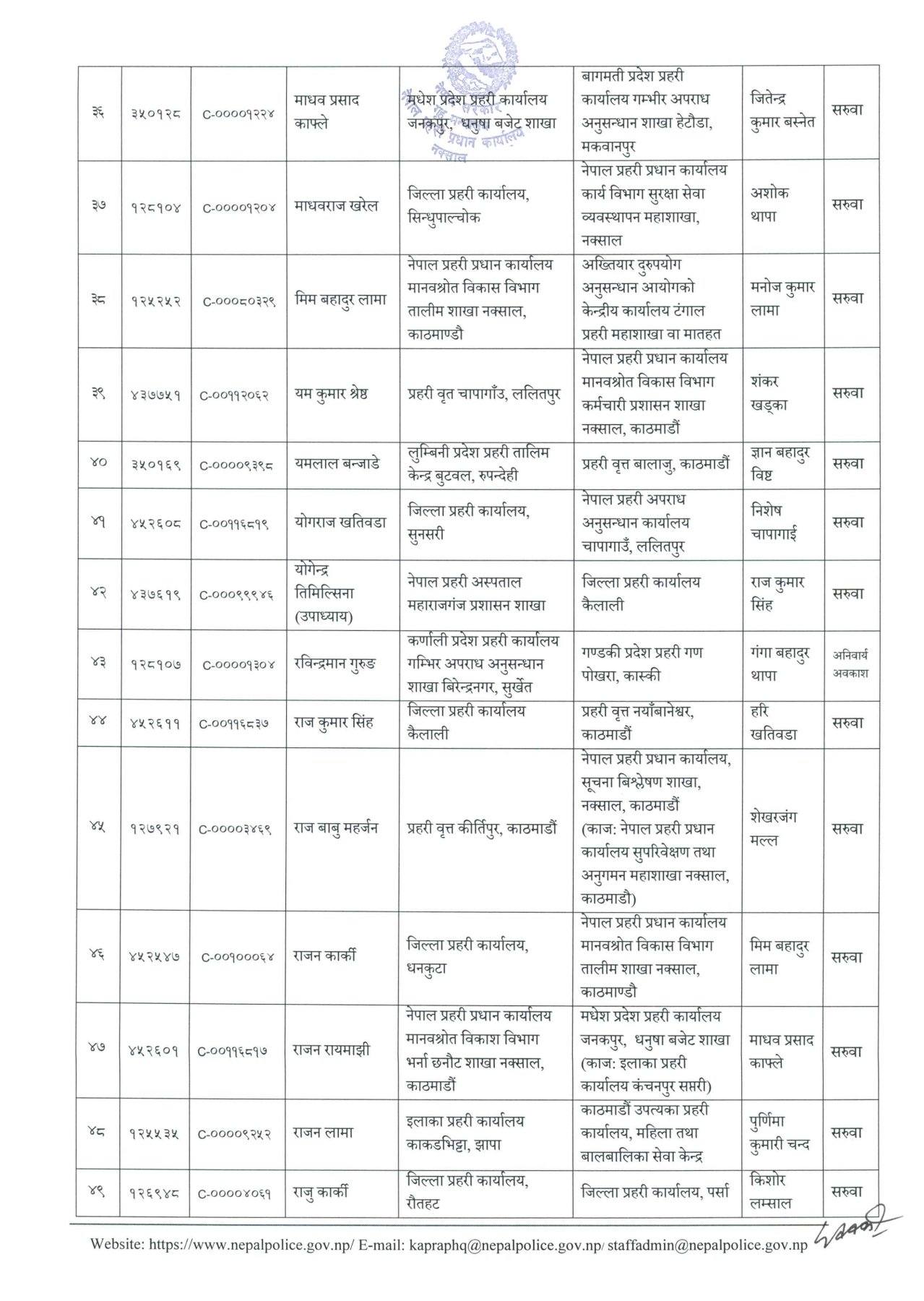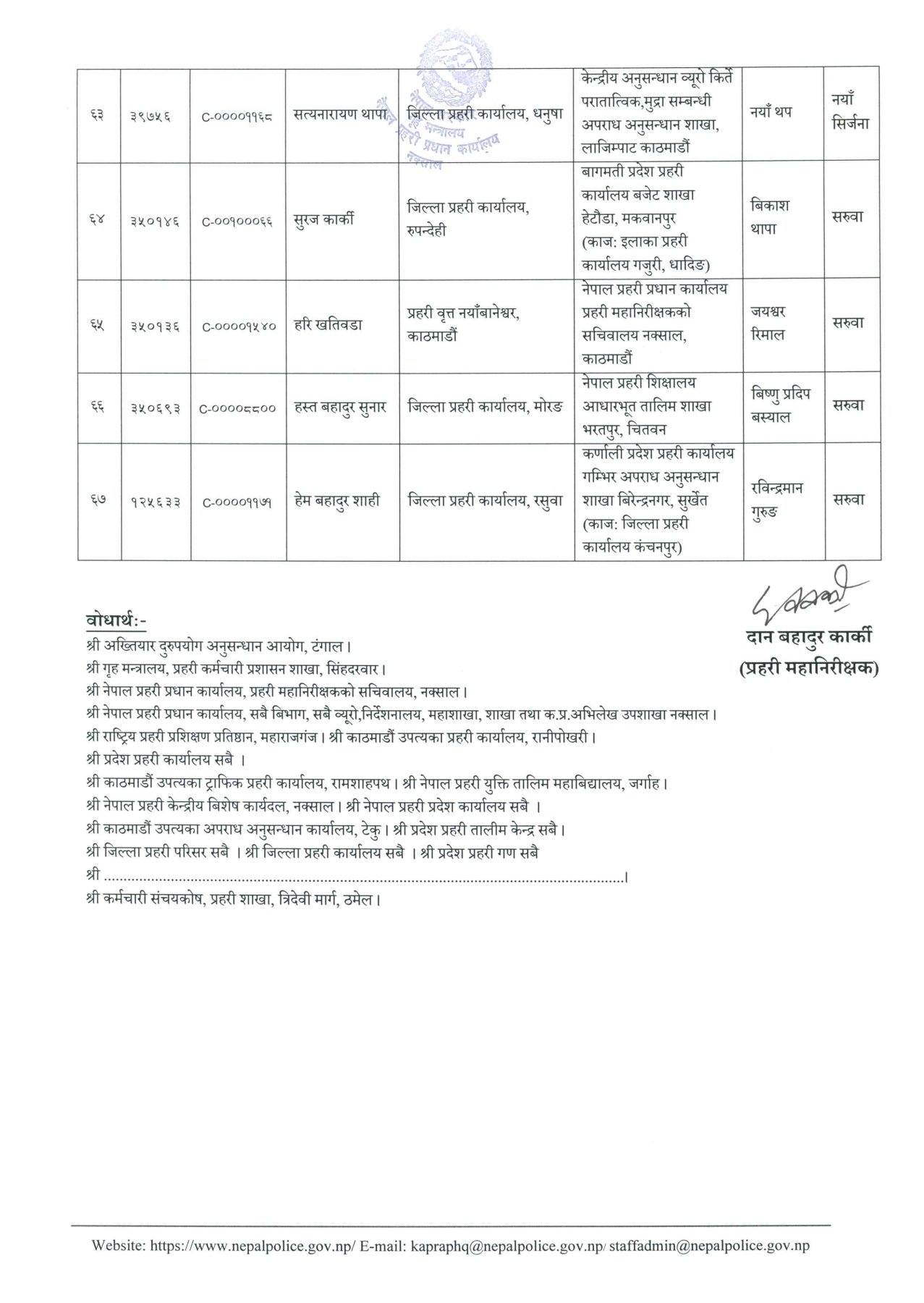प्रहरी वृत्त महाराजगन्जमा नवराज पोखरेल, वृत्त लैनचौरमा पुरुषोत्तम खड्का, बालाजुमा यमलाल बञ्जाडे, नयाँ बानेश्वरमा राजकुमार सिंह र चापागाउँमा शिला थापालाई सरुवा गरिएको छ । प्रहरी वृत्त जनसेवामा चन्द्रबहादुर थापालाई पठाइएको छ ।