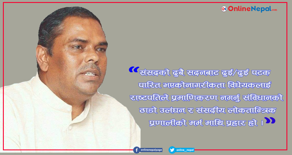 राष्टपतिले नागरीकता विधेयक प्रमाणिकरण नगर्नु संविधानको ठाडो उलंघन हो : उपेन्द्र यादव