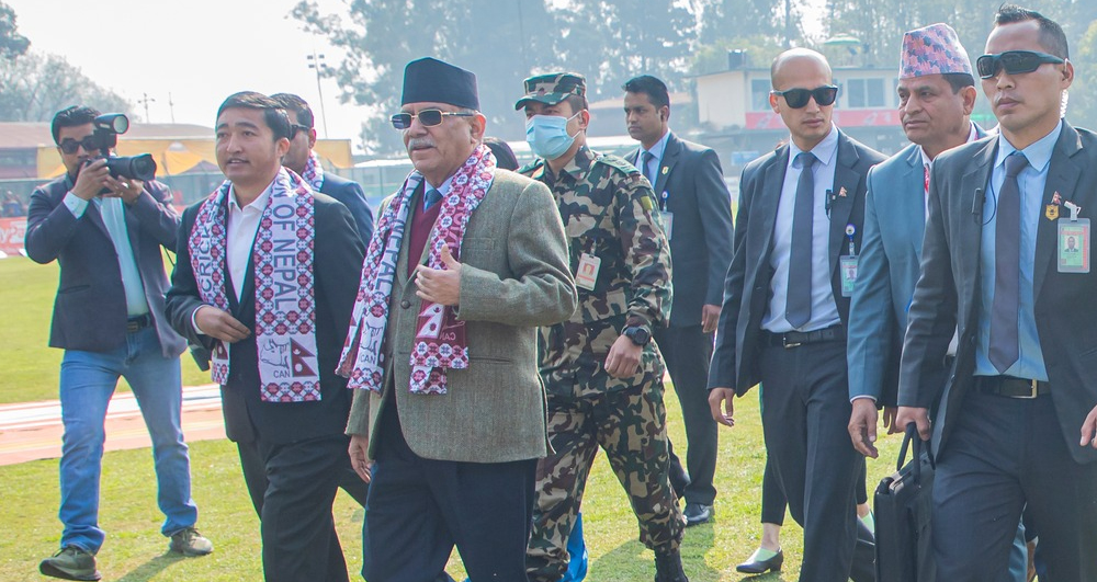नेपाल-यूएईबीचको क्रिकेट हेर्न प्रधानमन्त्री प्रचण्ड कीर्तिपुर मैदानमा